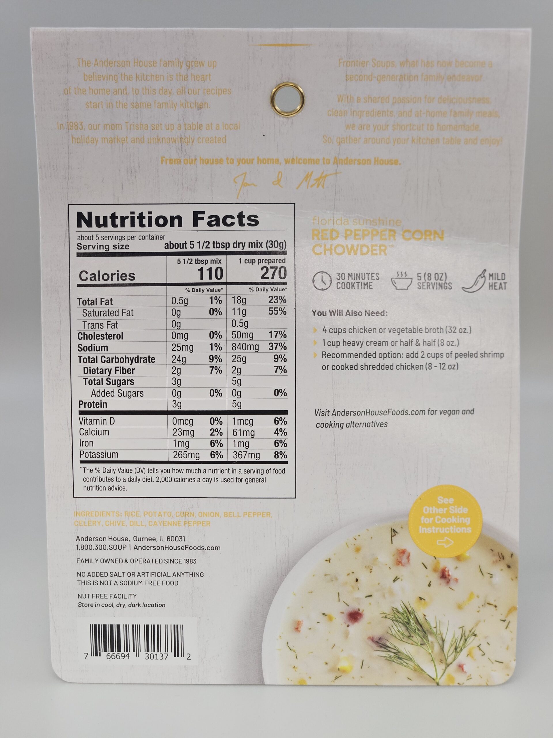 Florida Sunshine Red Pepper Corn Chowder Mix from Anderson House Hearty Meals Frontier Soups! Clearly made from ingredients you know. Non-GMO Gluten-Free Nothing Artificial No Added Salt 5oz / 142g, serves 5