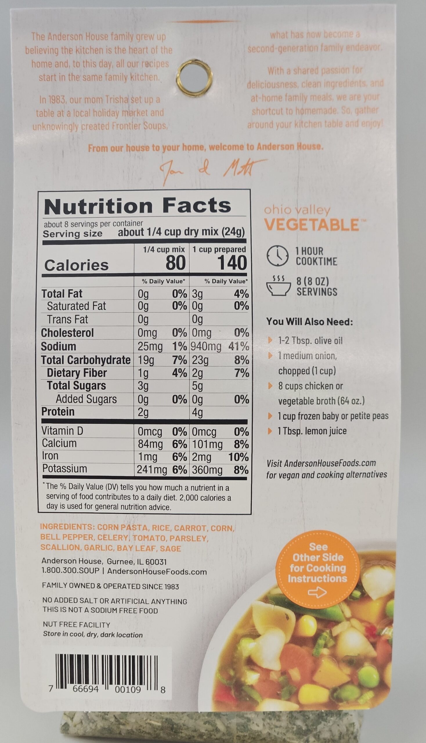 Ohio Valley Vegetable Soup Mix from Anderson House Hearty Meals Frontier Soups! Clearly made from ingredients you know. Non-GMO Gluten-Free Nothing Artificial No Added Salt 7oz / 198g, serves 8