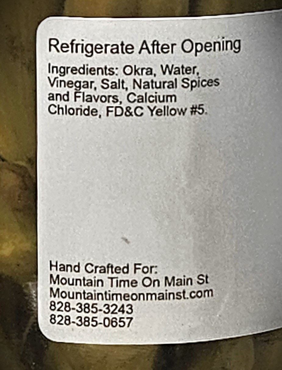 Delicious pickled okra exclusively from Mountain Time on Main Street! Enjoy in a salad, as a side for burgers or hot dogs, or straight from the jar. 16oz / 473ml