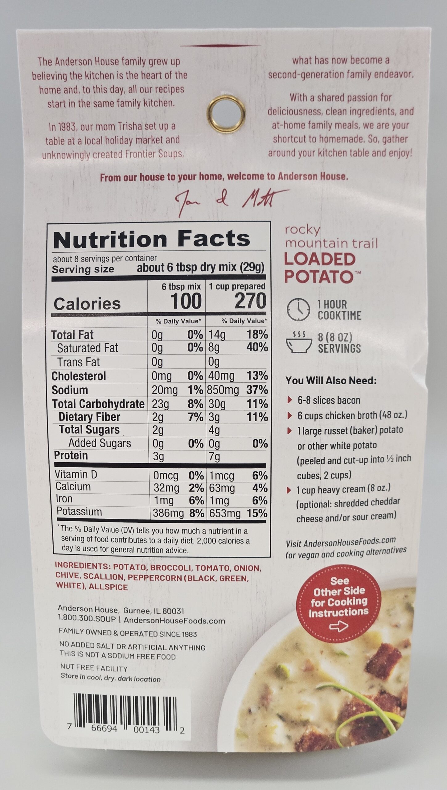 Rocky Mountain Loaded Potato Soup Mix from Anderson House Hearty Meals Frontier Soups! Clearly made from ingredients you know. Non-GMO Gluten-Free Nothing Artificial No Added Salt 8oz / 227g, serves 8