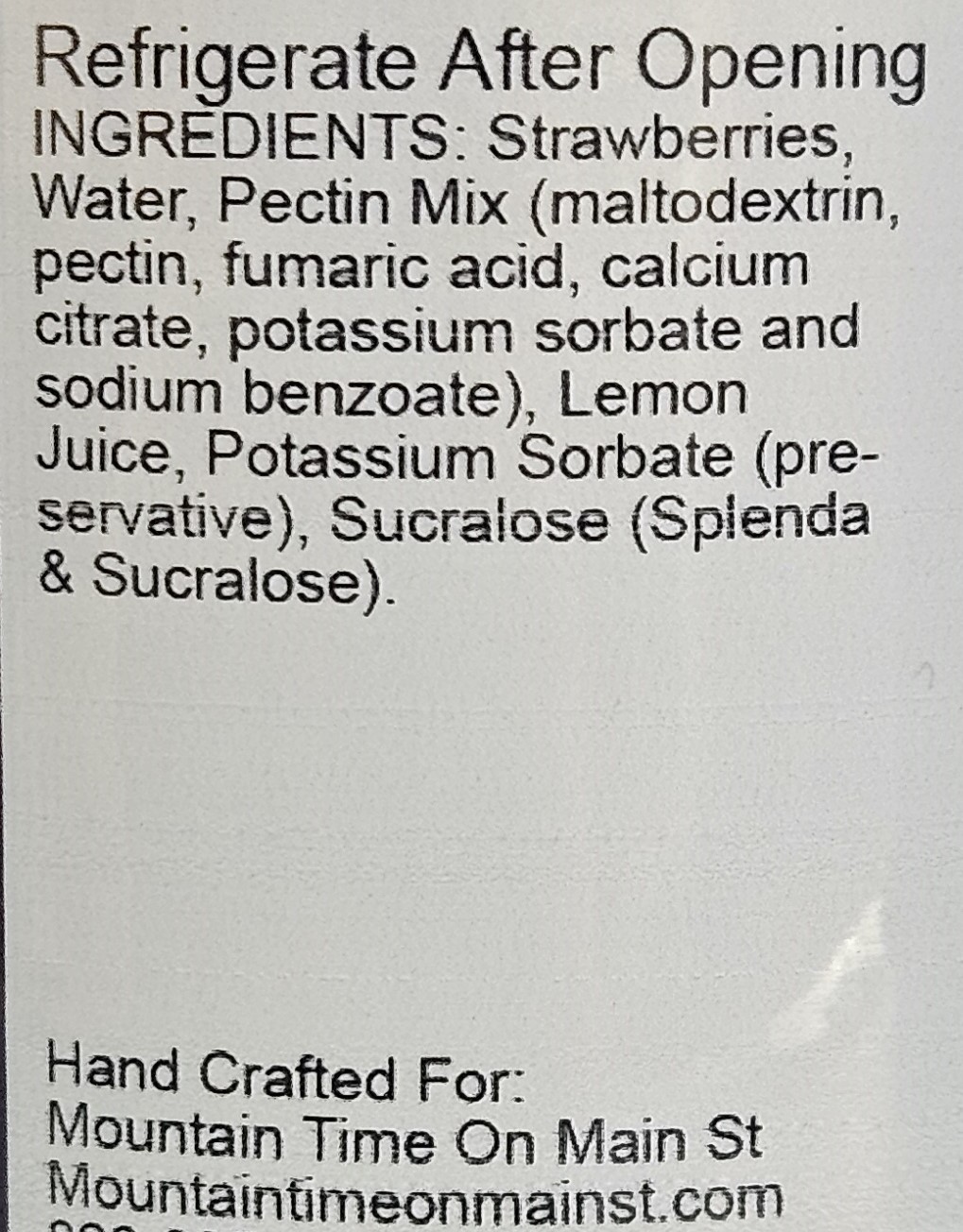Mountain Time on Main Street’s no-sugar added strawberry preserves are so good, you won’t know it’s sweetened with Splenda. Cut the sugar, not the flavor! 16oz/453g